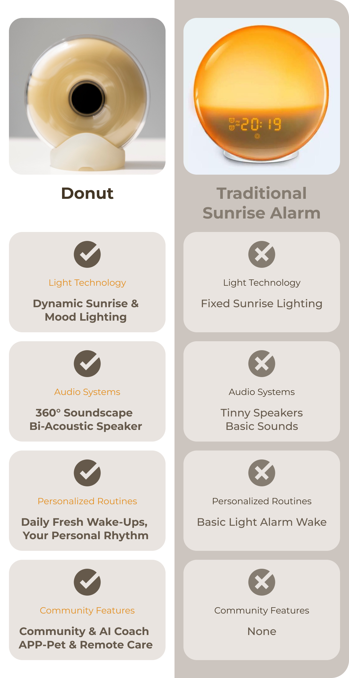 Donut is more than a lamp or alarm—it's a sleep companion using scientifically backed light and sound. Unlike typical alarms, it gently guides your biological clock with 10,000+ global sunrise spectra and natural soundscapes, helping you wake naturally and start your day stress-free.